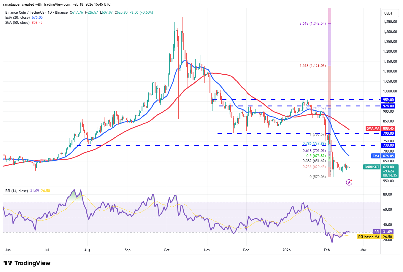 If the BNB price turns down and plummets below the $570 support, it indicates the resumption of the downtrend. The BNB/USDT pair may then extend the decline to the psychological level at $500.