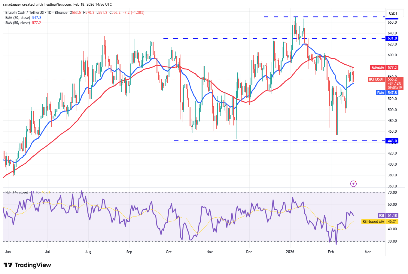 The upsloping 20-day EMA ($547) and the RSI just above the midpoint suggest a possible upside breakout. If that happens, the Bitcoin Cash price might rally to $600 and, after that, to $630.