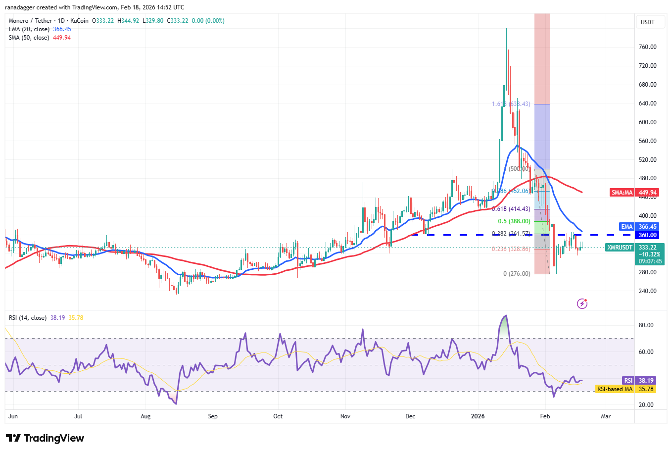 Monero (XMR) remains below the breakdown level of $360, but a positive sign is that the bulls have not allowed the price to slip below the immediate support at $309.