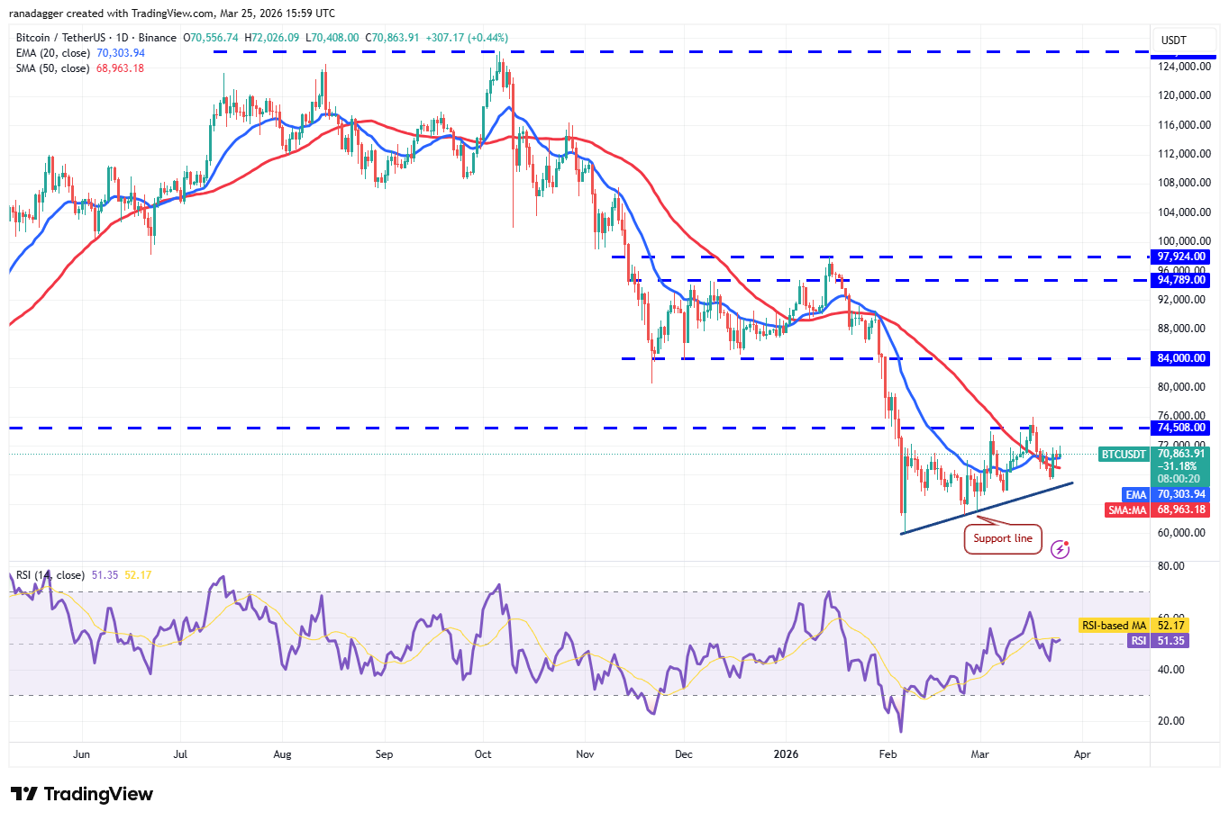 The flattish 20-day exponential moving average ($70,303) and the relative strength index (RSI) near the midpoint do not give a clear advantage either to the bulls or the bears. Buyers will have to drive and maintain the BTC price above the $74,508 resistance to complete the ascending triangle. If they manage to do that, the BTC/USDT pair may rally to $84,000.