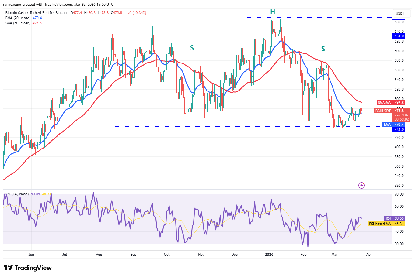 Bitcoin Cash (BCH) closed above the 20-day EMA ($470) on Monday, but the bulls are struggling to push the price to the 50-day SMA ($492).