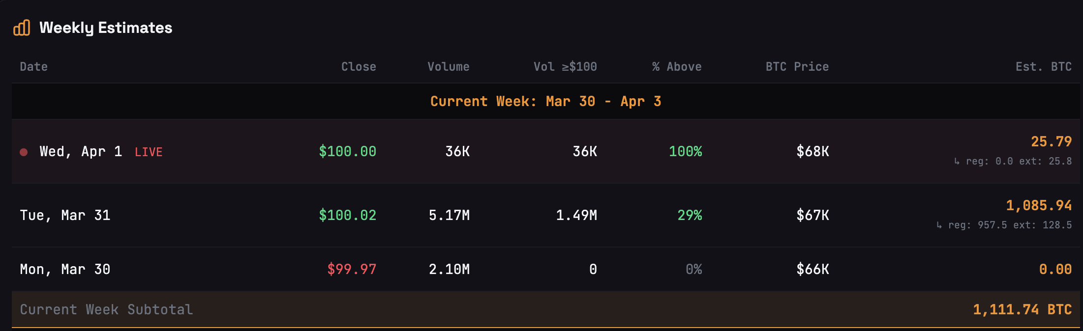 This is a shift from the previous week, when STRC traded mostly below par and generated no estimated BTC purchases.